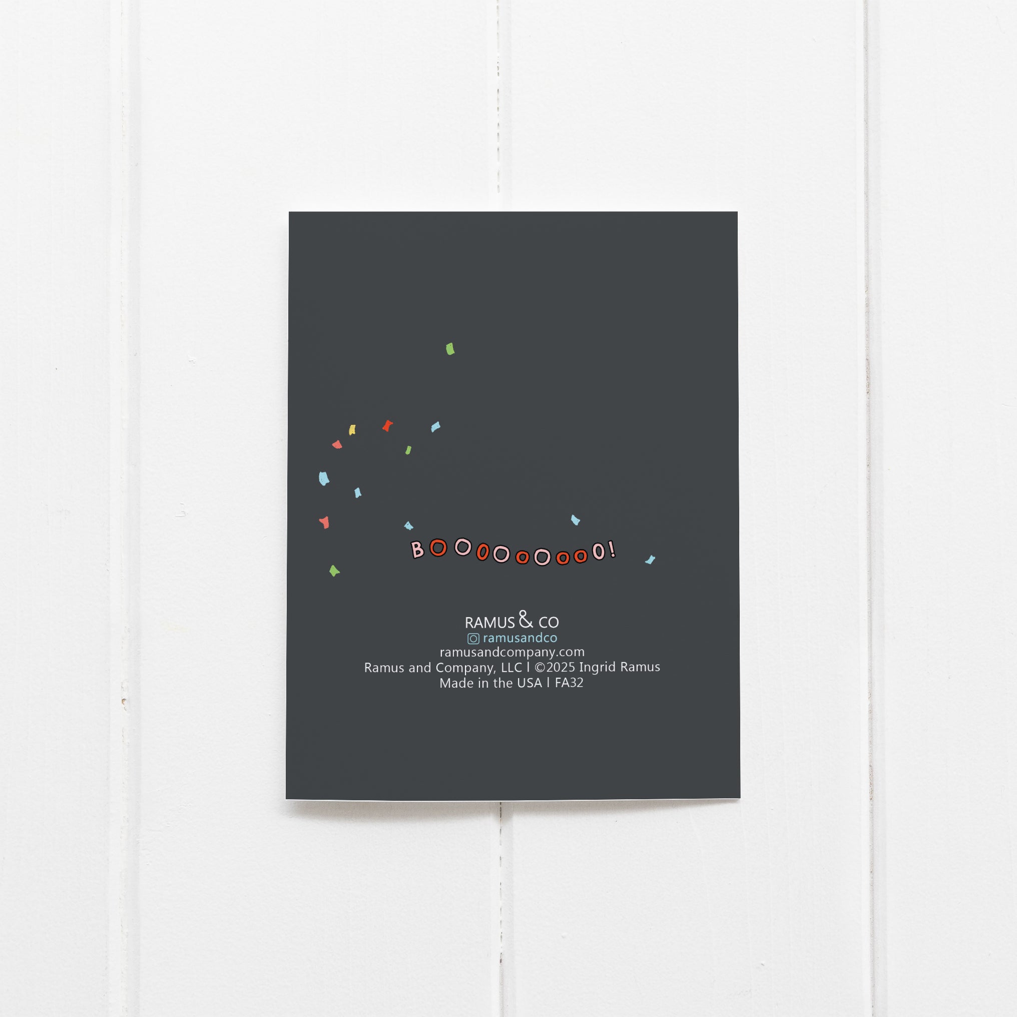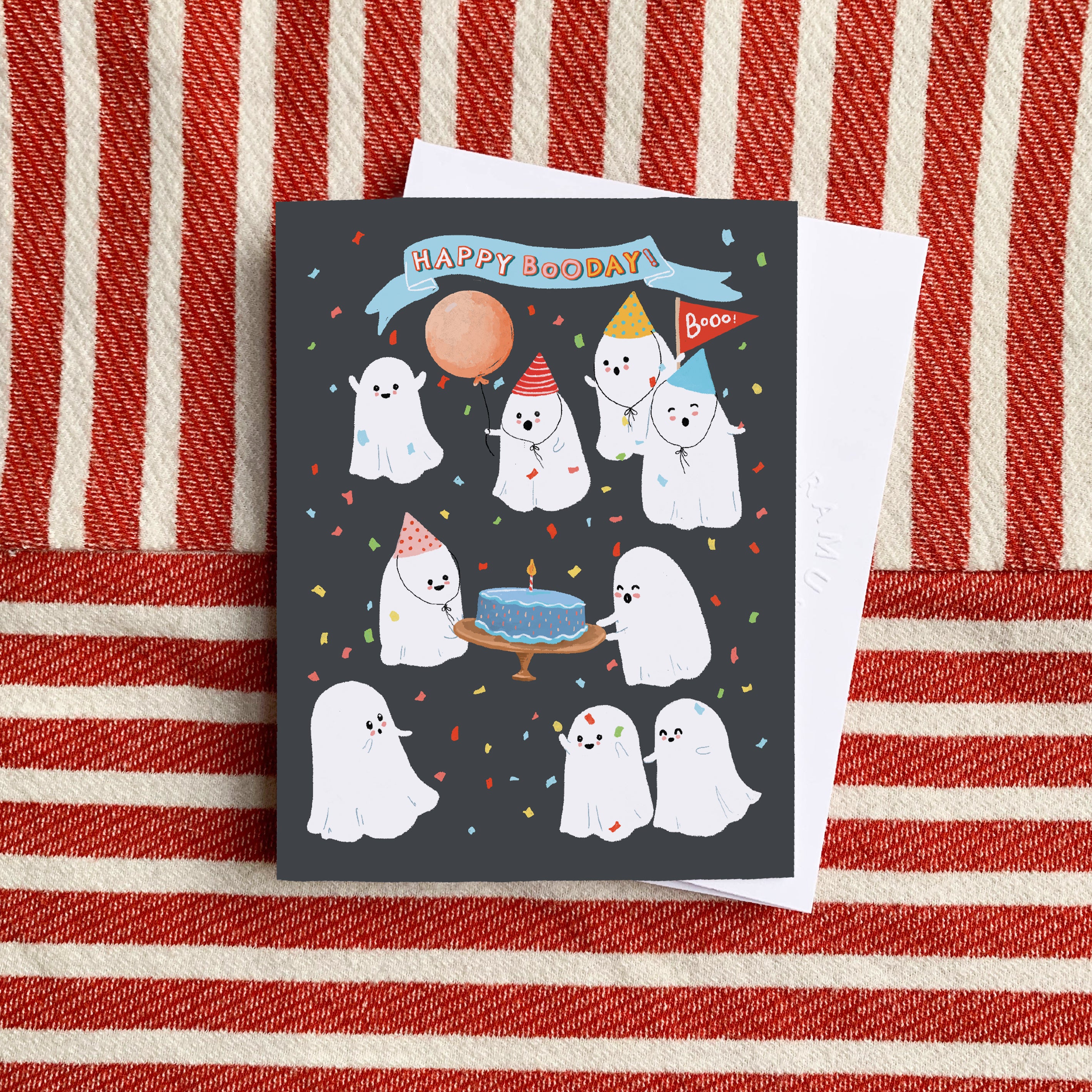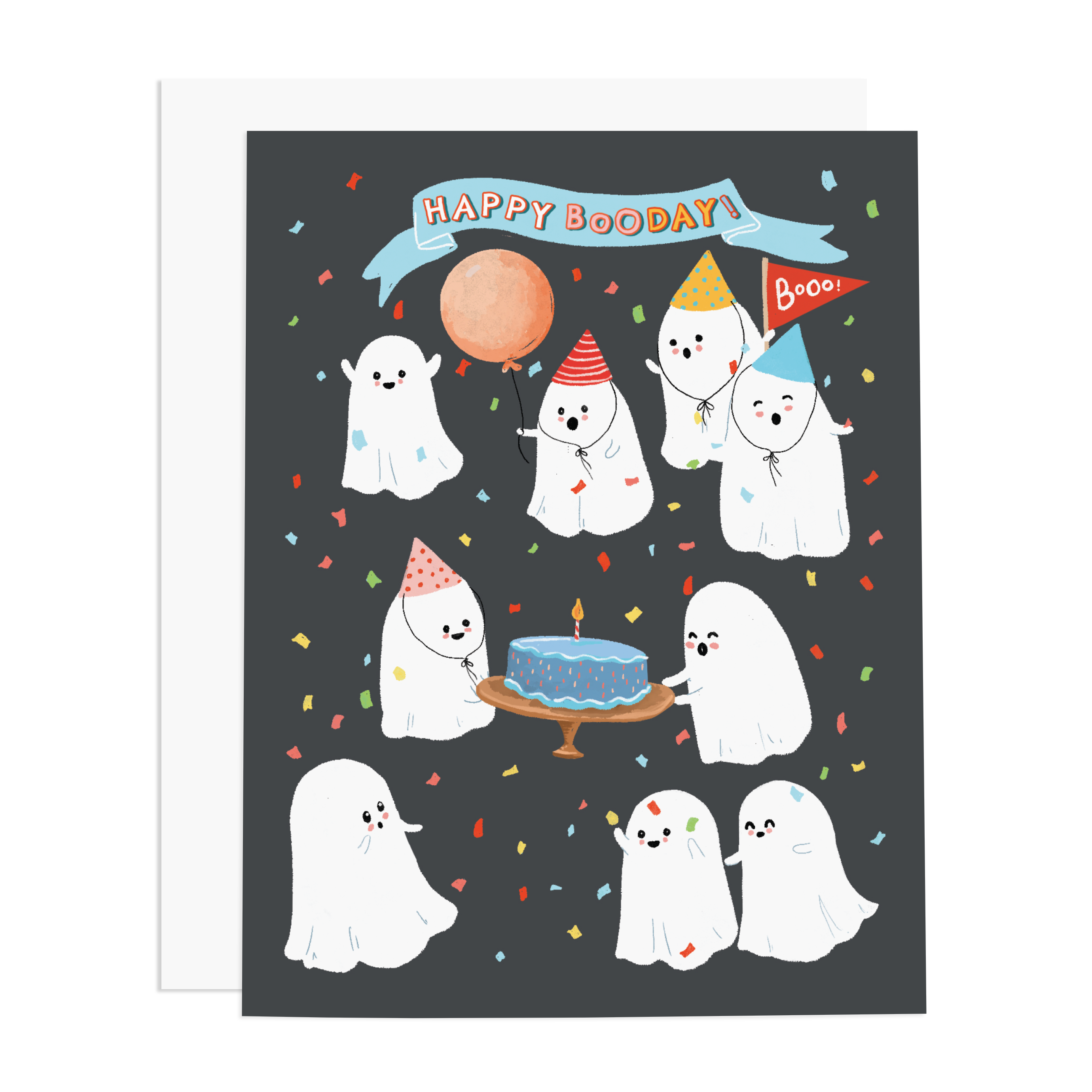 Celebrate a spook-tacular birthday with this charming "Happy Booday" ghost party card! Hauntingly fun wishes, eerie-sistible cheer, and ghostly good vibes!