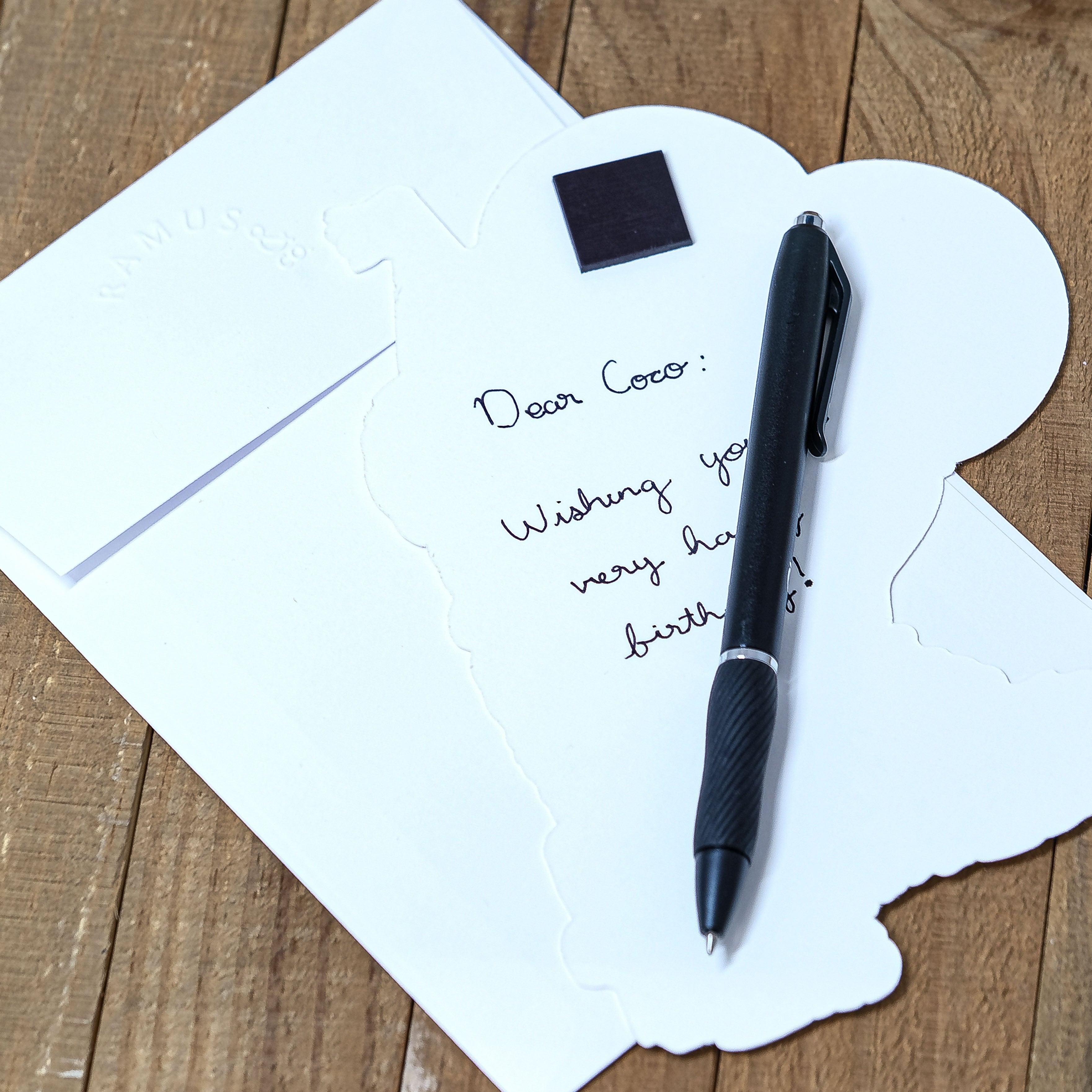 Ramus & Co. Fridge Cards are adorable keepsake cards that will last well beyond the moment. This die-cut 5" x 7" card is beautifully printed on premium stock and finished with a small but strong magnet on the back - plenty of room to write a message and perfect for displaying on the fridge or any magnetic surface. Each card comes with a crisp top-flap, hand embossed, peel-and-stick white envelope. Proudly made in the USA.
